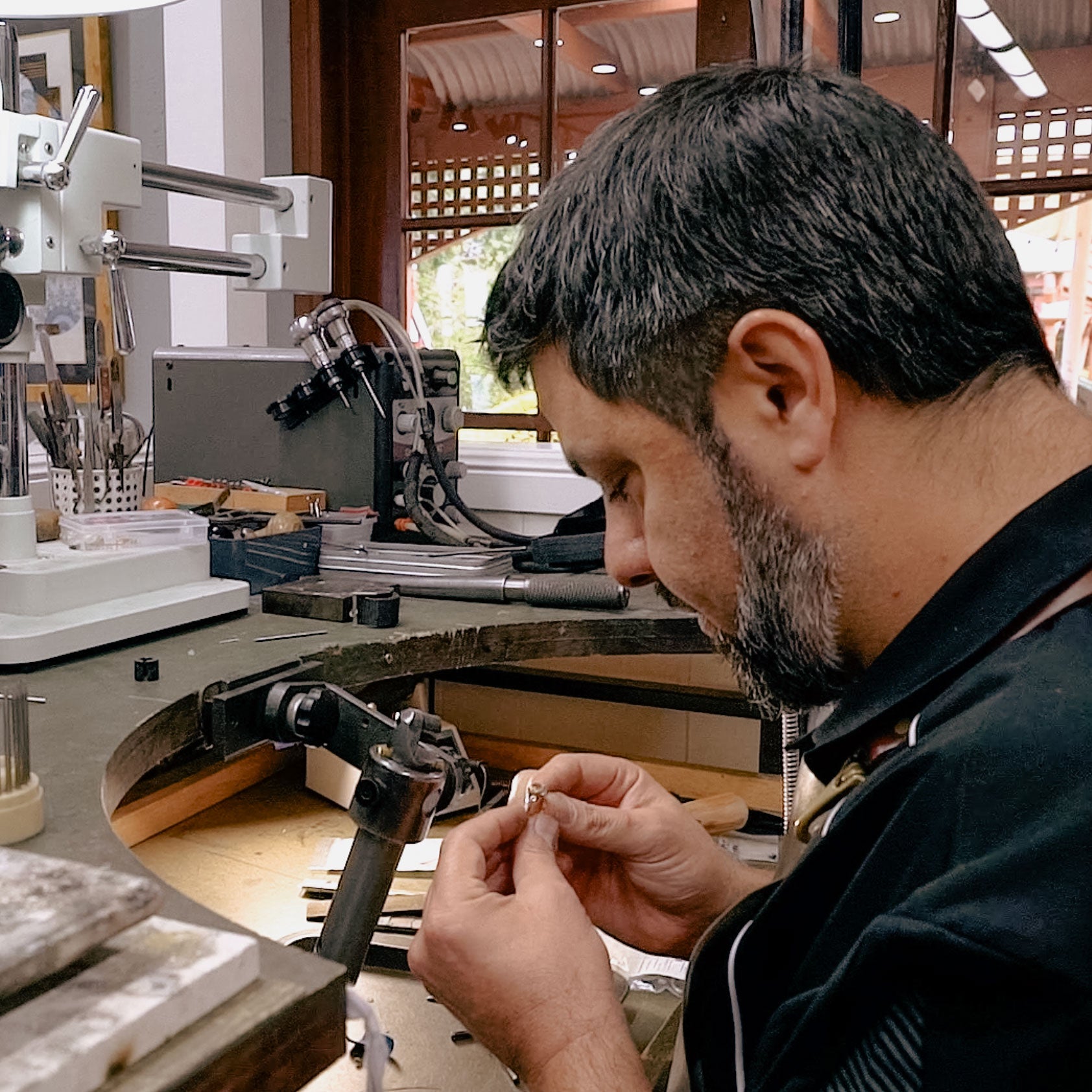 Utilising your existing gold and gemstones, all repairs, remodels and bespoke designs are made in his Montville gallery onsite workshop near the water wheel.